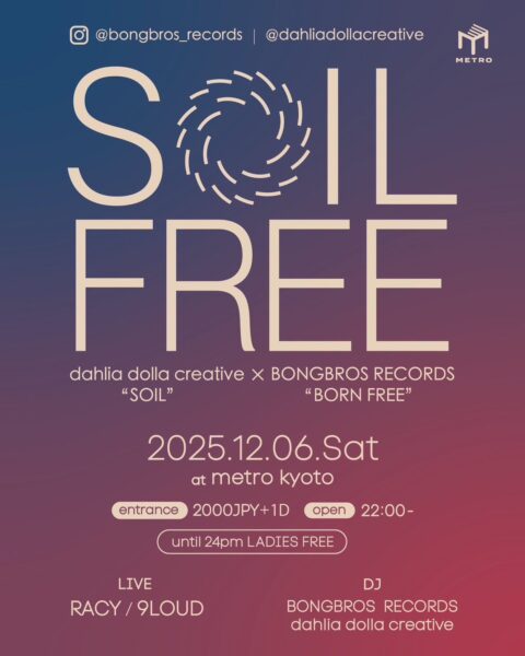 <前売絶賛発売中!!!> 12/13 TAKKYU ISHINO IN KYOTO METRO <前売絶賛発売中!!!> 1/12 hommy 12/5 CLUB80's 30th anniversary final 12/6 “SOIL FREE” – dahlia dolla creative”SOIL” × BONGBROS RECORDS”BORN FREE”- 12/9 A-Tweed Recording by TSUBAKI fm Kyoto 12/20 DEN-EN 12/22 ロードリ・デイヴィス 鈴木昭男 デュオ・ライヴ 12/29 〜GOOD morning RECORD BAR 4th anniversary〜 『GOOD morning METRO 2025』