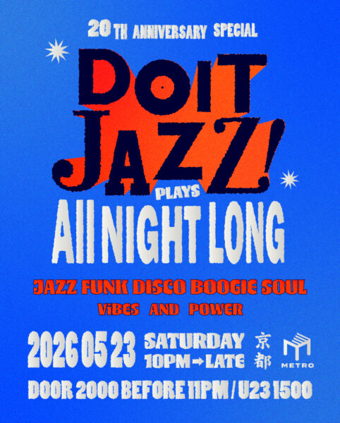 これまで国内外のアーティストを招き、様々なフィールドで活動してきたDoitJAZZ!が、その音楽を純度高く表現するレジデントDJのみの一夜は、10周年以来、実に10年ぶりとなる。オーガニックなJAZZで踊る衝撃から始まった長い旅は、同じ志を持つDJ/アーティストとの交差の中で様々な音楽へと深化し、そのすべてを凝縮してフロアへ還元する一夜となる。あなたたちのVIBESととも現在地と原点が交差する特別なオールナイトロング。