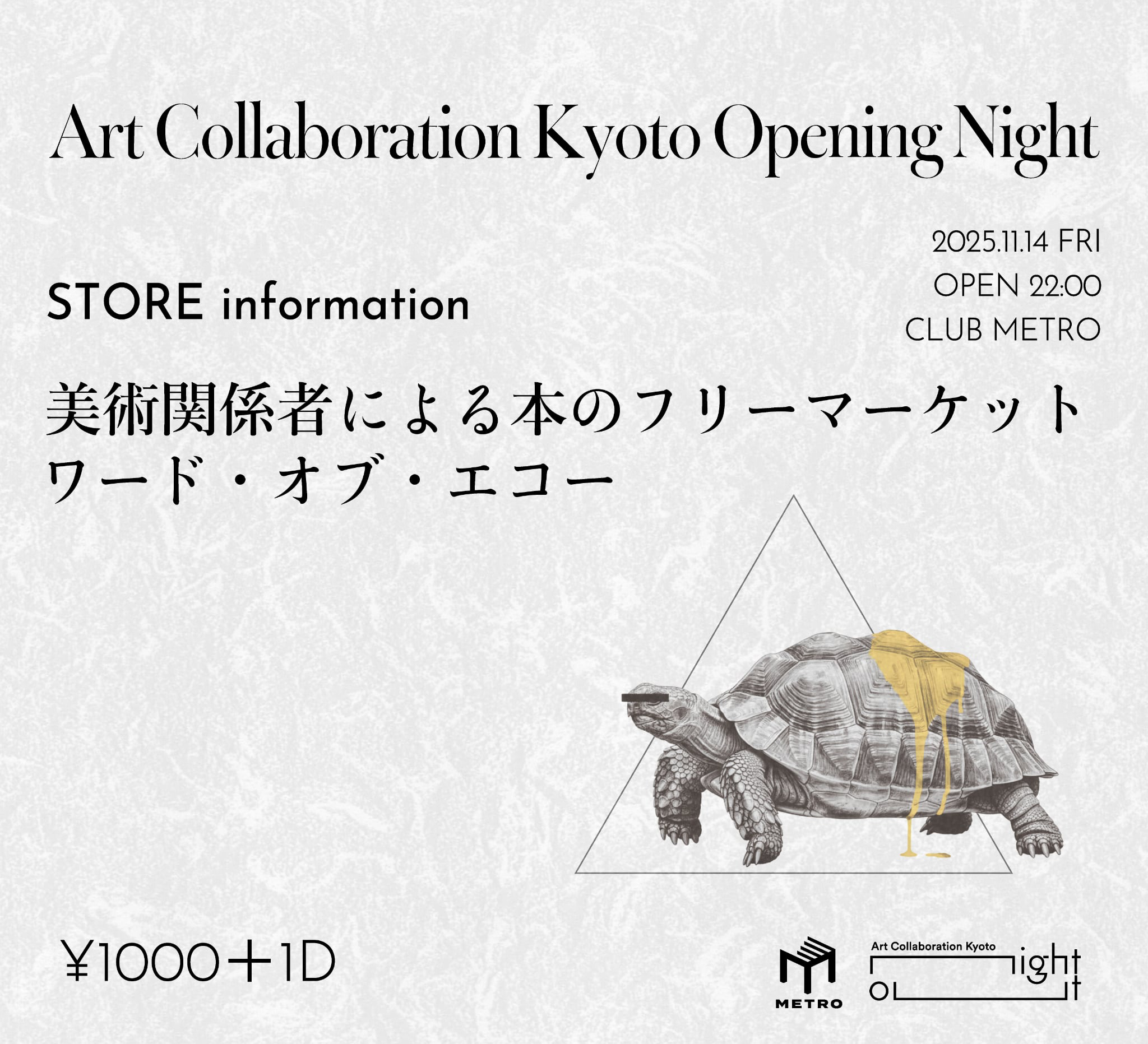 またストアとして美術関係者による本のフリーマーケット:ワード・オブ・エコーも開催。美術家・批評家・研究者らに依頼し、蔵書から「誰かに読まれたらうれしい本」「本棚がいっぱいになったから手放そうと思っていた本」などを選んでいただき、フリーマーケットを開催します。自分にとって一区切りがついた本が、次の誰かの手元で新しい意味を持つということは、それだけで静かだけれど確かな価値のある出会いです。本を介して文化を分かち合い、想像力を広げることは、あらゆる人が共に生きることを考えるための一歩につながるはずです。集まった本はクラブの空間に小さな書店/図書館のような場を仮設します。それらは展覧会等とは違った角度の美術にまつわる対話を生み出します。