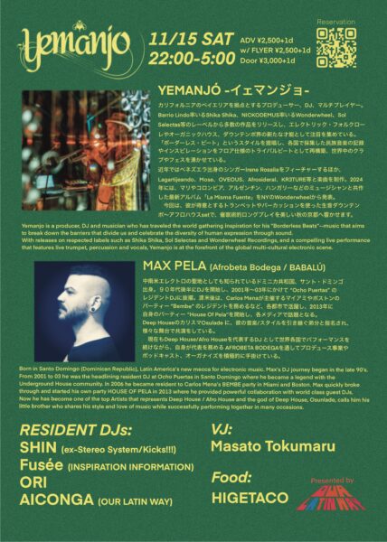 カリフォルニアのベイエリアを拠点に、トライバルビートの名手として世界各国で活躍中のYEMANJÓが、今回はトランペットやパーカッションを使った生音ダウンテンポ〜アフロハウスsetを美しい秋の京都へ響かせます。ドミニカ共和国出身でDeep House/Afro Houseを代表するTOP DJ として世界各国で活躍中のMAX PELAを筆頭とした、デジタル&オーガニックグルーヴ最先端の京都DJ勢もお見逃しなく!