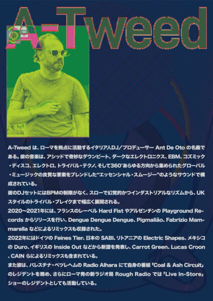 A-Tweed は、ローマを拠点に活動するイタリア人DJ/プロデューサー Ant De Oto の名義である。彼の音楽は、アシッドで奇妙なダウンビート、ダークなエレクトロニクス、EBM、コスミック・ディスコ、エレクトロ、トライバル・テクノ、そして360°あらゆる方向から集められたグローバル・ミュージックの良質な要素をブレンドした”エッセンシャル・スムージー”のようなサウンドで構成されている。