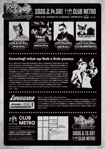今回はラバ現役40年間働いてくれてるスピーカーを作ってくれたRANKIN-TAXIをゲストに,その他最高のステージショー,キラーサウンドが炸裂…サプライズゲストが何人か…当日楽しみに来てください。