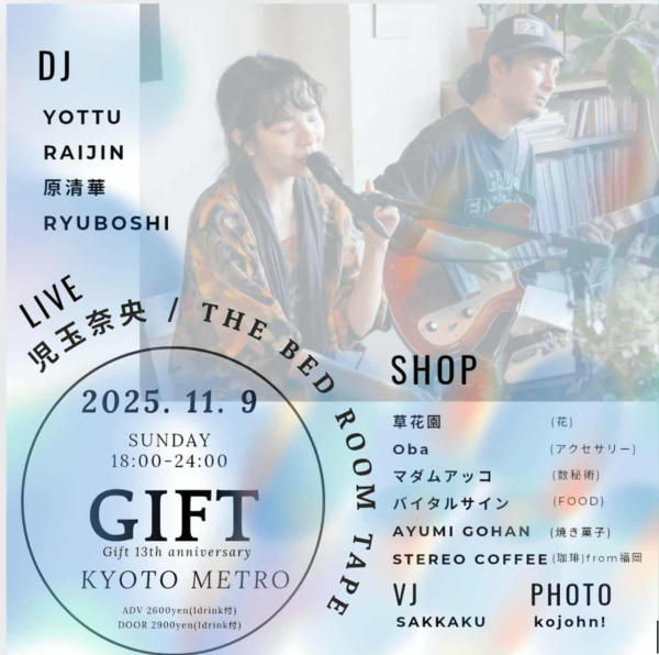長い音楽活動の中幅広い幅広い音楽シーンで愛されるシンガーソングライター児玉奈央、Nabowaとして結成20年の活動と、トラックメーカーとしての評価も高い影山奏のソロプロジェクト THE BED ROOM TAPEがライブで登場。今回はスペシャルなLIVE構成、この日しか見れないGiftスペシャル仕様です。