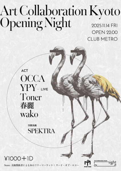 「コラボレーション」をテーマに掲げ、京都で開催される現代美術のアートフェア、Art Collaboration Kyoto(ACK)が、今年も5年目を迎えます。日本最大規模の現代アートフェアであるACKは、国立京都国際会館を舞台に、国内外のアーティストやギャラリー、行政と民間、美術と他領域とのクロスオーバーを実現し、新たなクリエイティブの地平を広げていきます。そしてその開幕日夜に京都CLUB METROにてオープニングパーティーを開催します。