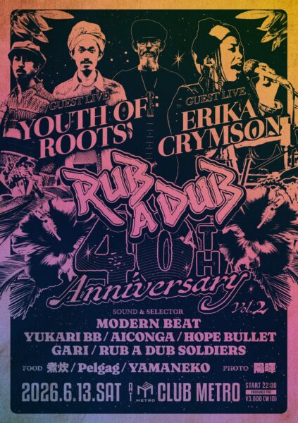 1986年2月のオープン以来、老舗レゲエバーとして日本全国にその名を轟かすレゲエの聖地、三条木屋町の「RUB A DUB」が遂に祝40周年!!! 先日開催の第一弾もラバダブ愛に溢れとてつもなく盛り上がりましたが、今宵はそんな伝説的名店の40周年記念大感謝祭パーティー第2弾を開催!! 今回もLIVEにセレクターにとラバダブゆかりの豪華ラインナップが今回も大集結です!